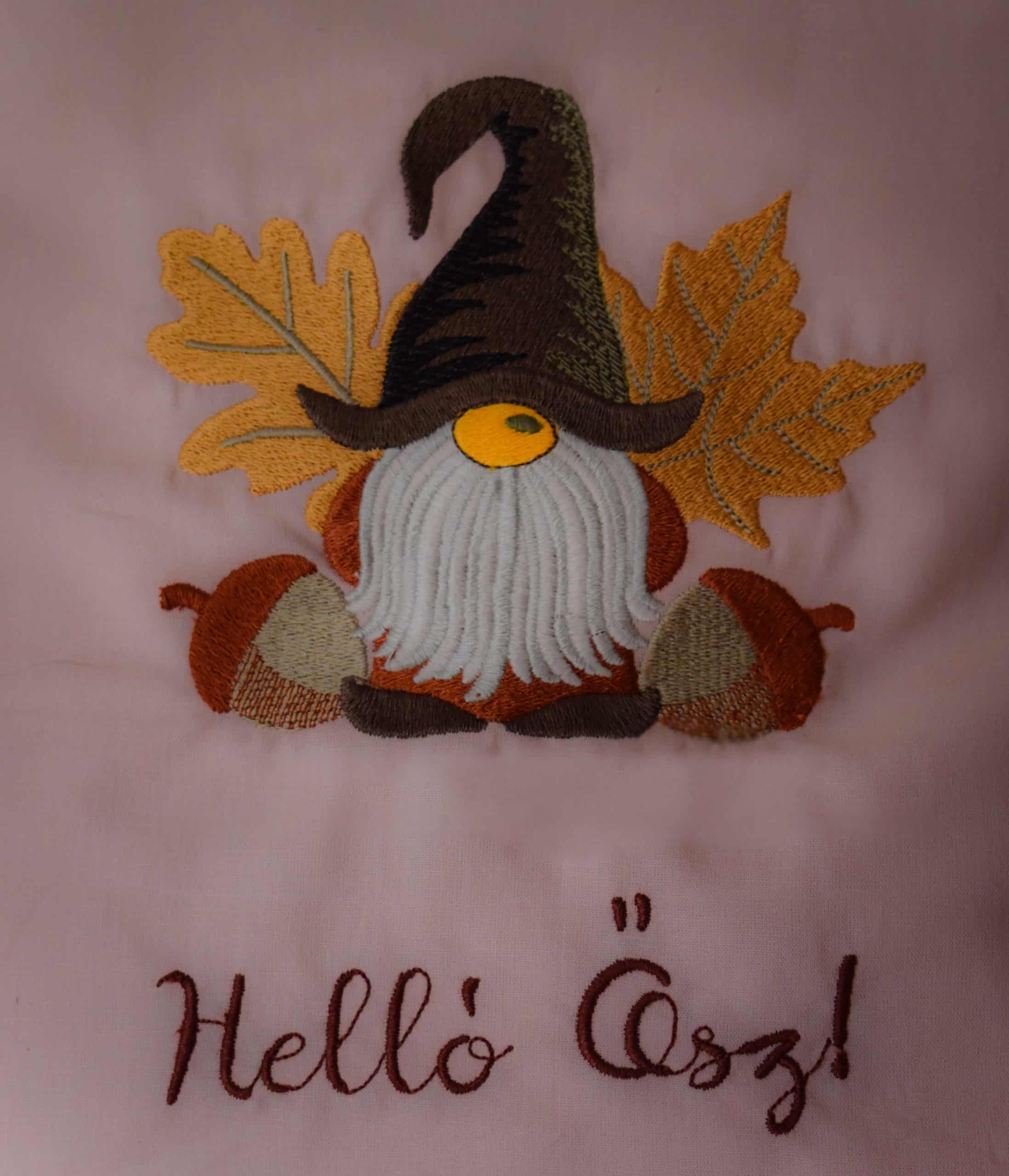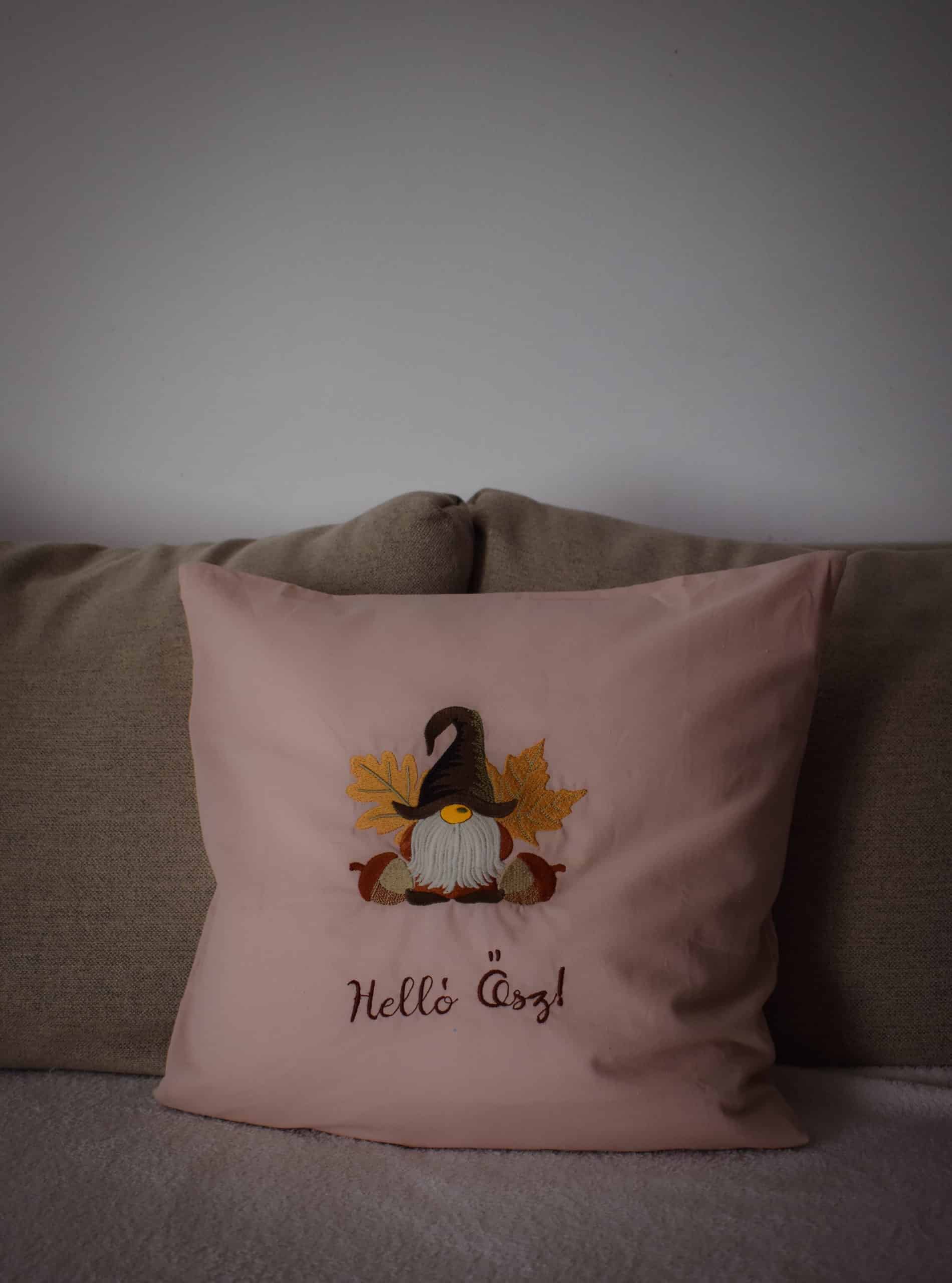 Üdvözöljük az ősz báját ezzel a varázslatos, hímzett manót ábrázoló párnával!
