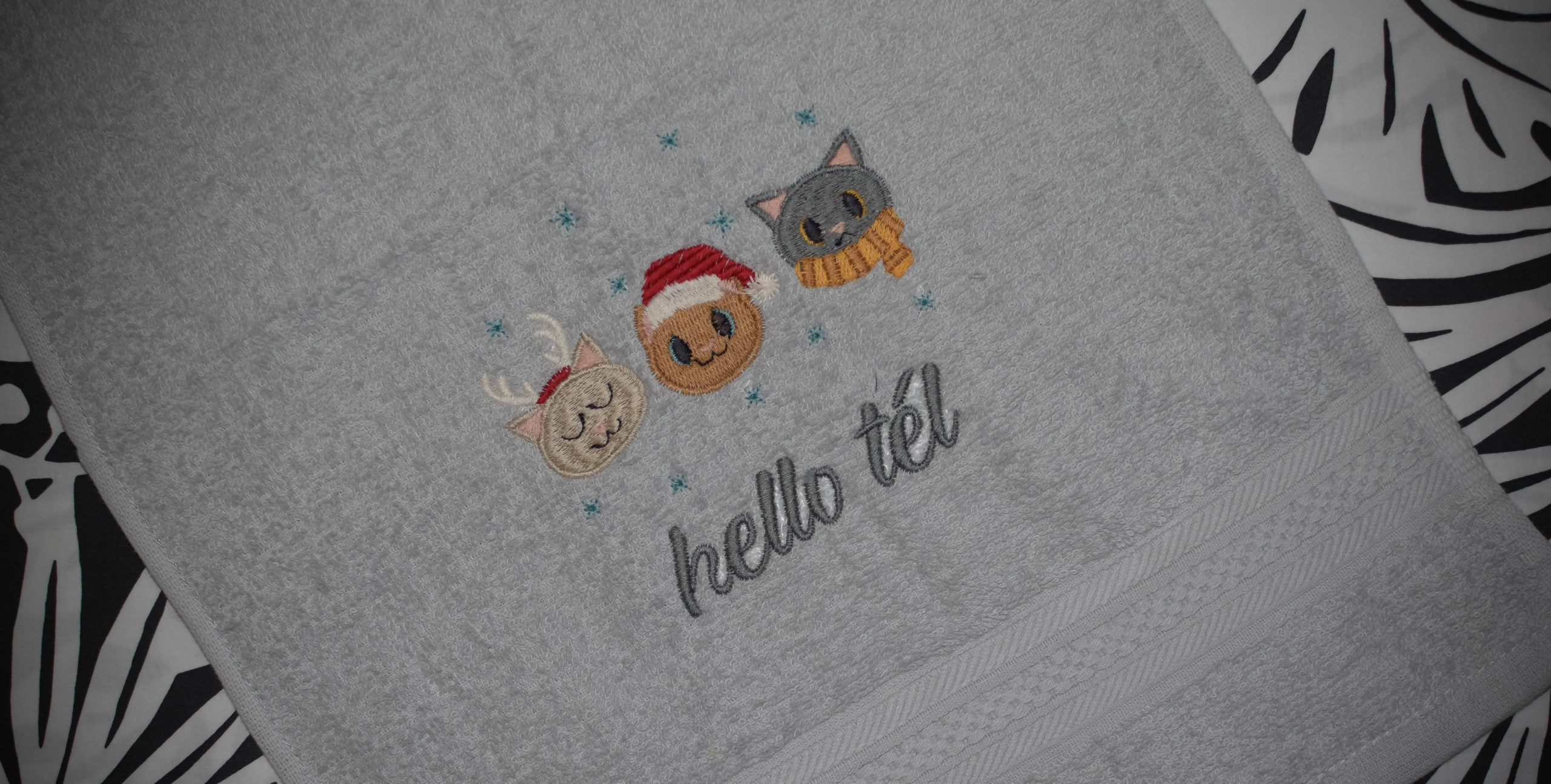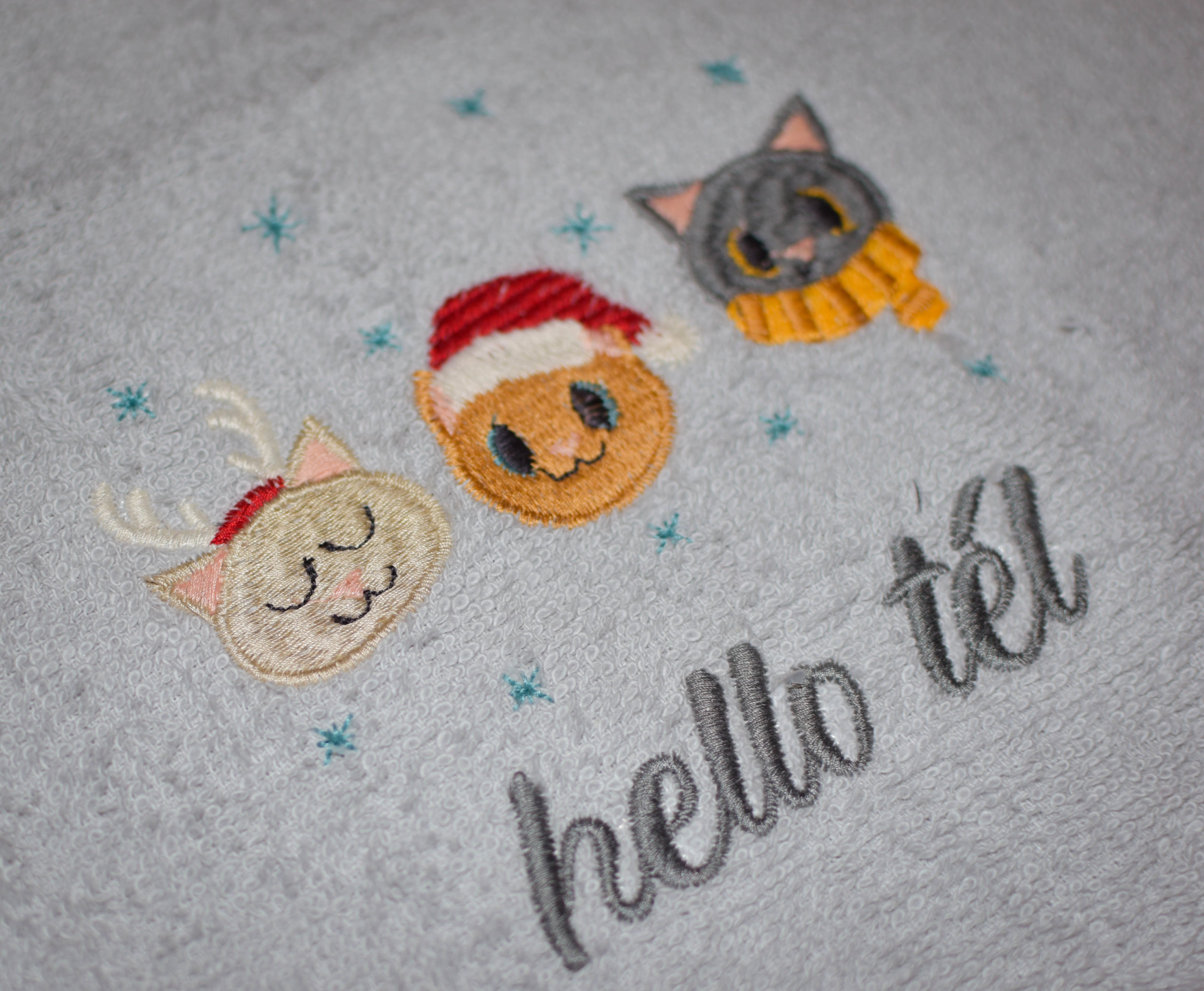 Fedezd fel a varázslatos téli hangulatot ezen egyedi hímzett, cuki cicás kéztörlőn!